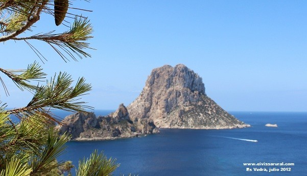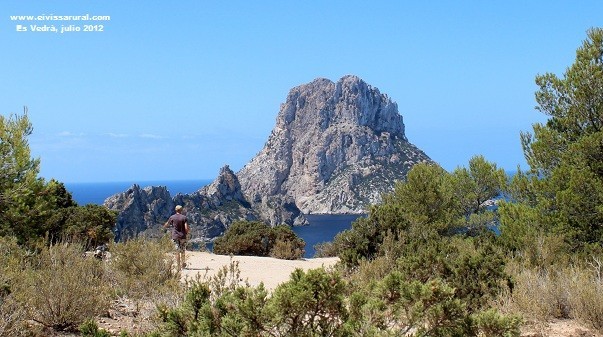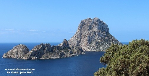 Y configura uno de los paisajes más sorprendentes de todo el Mediterráneo. Es algo que ya percibió el Archiduque Luis Salvador: «Sus desnudas formaciones rocosas se nos aparecen en cálidas tonalidades, el mar se nos antoja más azul y transparente que nunca, y el conjunto parece tan etéreo, pese a lo bien dibujado de sus perfiles, que resulta difícil imaginar que pueda existir mayor belleza con tan acusado carácter mediterráneo». Y no importa que su imagen, a fuerza de repetirla, resulte tópica y de ´postal´, porque, aun así, es Vedrà conserva su potencia telúrica, su capacidad mítica, su primitivo magnetismo. Hay ´algo´ en él que nos impacta, nos atrae y, al mismo tiempo, nos infunde prevención y respeto. No conozco a nadie que mantenga frente a es Vedrà una actitud indiferente. Suele provocar una exclamación de asombro y, en otros casos, nos deja mudos, absortos, abducidos. El diorama nos trasciende y es Vedrà parece irreal, como si el imponente monolito materializara la descripción enfebrecida de un poeta, de un místico o de un loco. Extemporáneo y atópico, es como si es Vedrà no tuviera que estar donde lo vemos y de ahí que se perciba como una irrupción, como una emergencia inesperada que se apodera del paisaje con absoluto protagonismo.