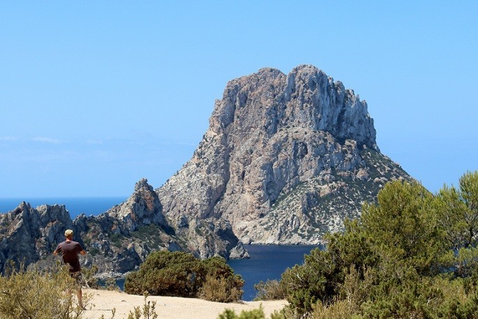 Desde la playa Cala D’Hort de la isla de Ibiza a 23 kilómetros al oeste de la ciudad del mismo nombre se puede apreciar la belleza del islote Es Vedrá, distante tan sólo unos cientos de metros de la costa. La pequeña isla que alcanza los 385 metros de altura, ofrece desde allí una imagen imponente, que se torna inquietante a medida que se acerca la noche.