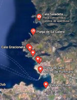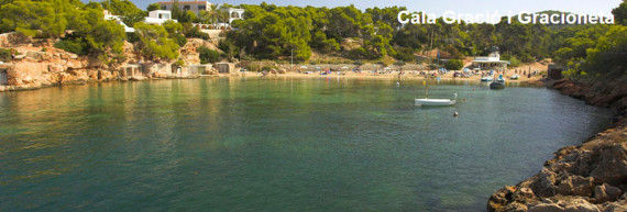 Cala Gracioneta y Cala Gració están a 1,5 kilómetros de Sant Antoni de Portmany, situadas entre los caps Negret y Blanc. Ambas playas forman parte del entrante de mar estrecho en forma de u que al tocar tierra las originó.