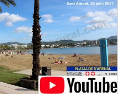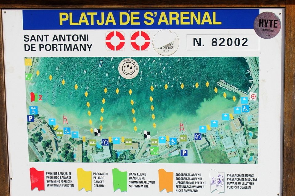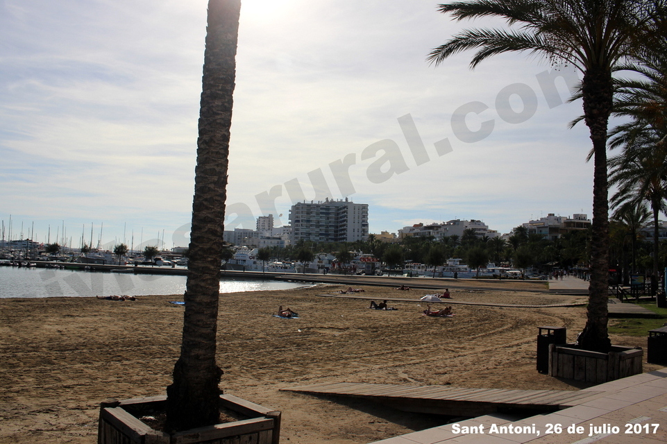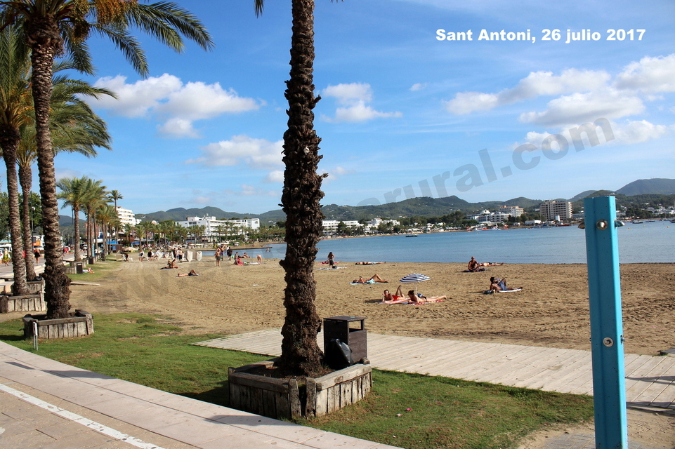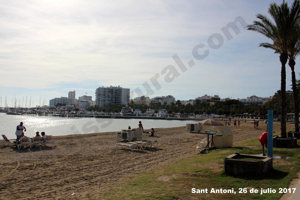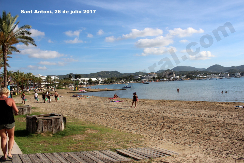 Composición (sustrato): Arena fina natural de color claro. Fondo marino: Arena, poca profundidas y suave desnivel. Entorno: Urbano, turístico. Localización: A 1,5 Km. del centro de Sant Antoni.