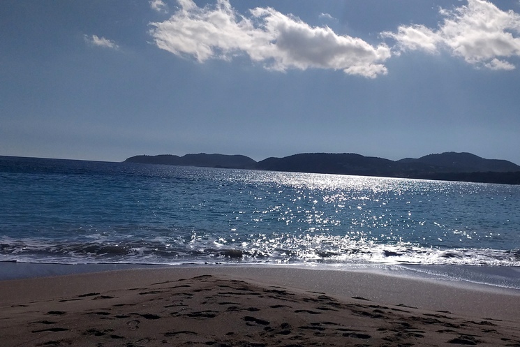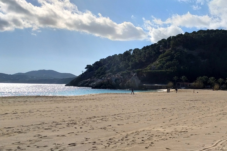 Composición (sustrato): Arena de grano grueso de color tostado. Fondo marino: Arena gruesa y cantos rodados. Escasa pendiente. Entorno: Natural. Localización: A 9 Km. de Sant Joan y a 25 km de Eivissa.