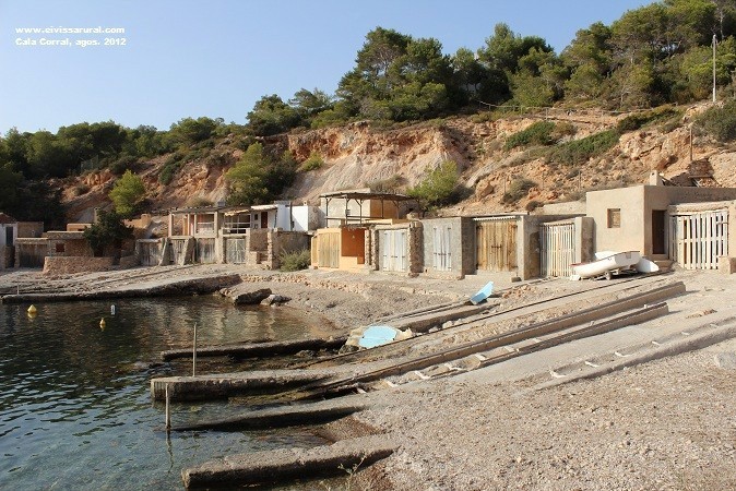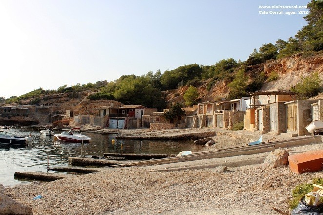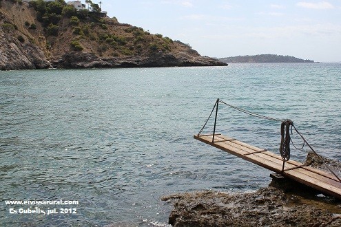 Cala des Cubells está a dos kilómetros de la población homónima, situada entre es Niu de s’Àguila y Cap Llumbí, así como bajo la mirada de Puig d’en Serra. Este rincón costero tranquilo se caracteriza por estar formado por un conjunto de tres calas consecutivas, separadas por rocas desprendidas de los cantiles, envuelta de acantilados altos y agrestes, así como por tener talud compuesto de cantos rodados y grava, pendiente pronunciada (a pocos metros de la orilla se superan dos metros de profundidad), agua transparente y fondo de grava, roca y alga que invitan a practicar buceo y submarinismo. Las condiciones marinas y subacuáticas son aptas para fondear embarcaciones, hallándose protegida de vientos del oeste y expuesta a los del sureste-sur-noroeste. Su lecho marino está a ocho metros de hondura. Este litoral escarpado potencia la blancura de sus peñascos con el encalado de las casas cercanas de es Cubells y, sobre todo, la de su iglesia, alzada sobre las rocas de este tramo de costa. De aquí el sobrenombre de Eivissa, illa blanca. El contraste aumenta al este de Cala des Cubells con la presencia de Cap Negret, farallón de color negro y punto más elevado de esta zona marítima. El acceso por carretera es sencillo siguiendo la señalización viaria y los desvíos. Los últimos 300 metros se realizará por pista hormigonada de gran desnivel. El vehículo particular se podrá estacionar gratuitamente por los alrededores. Las características descritas anteriormente explican la afluencia baja de bañistas turistas.