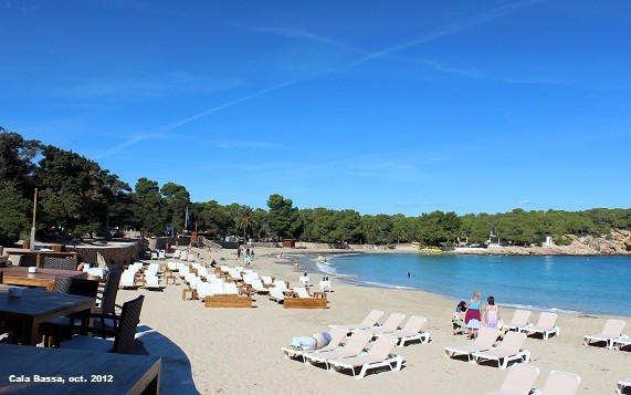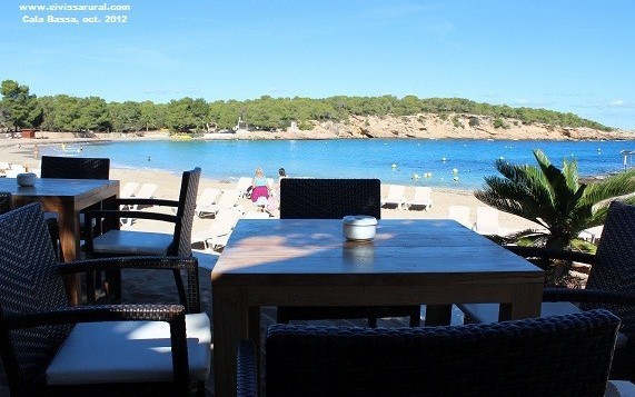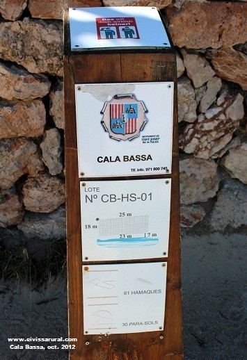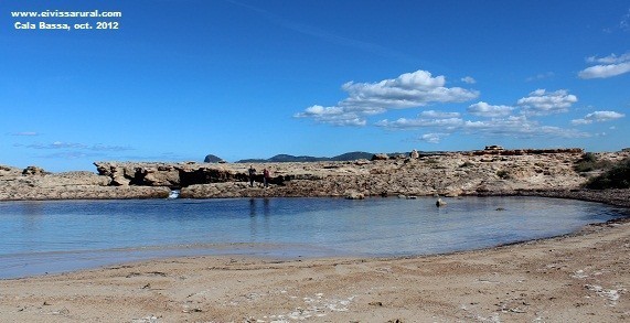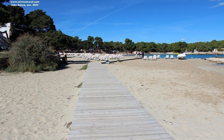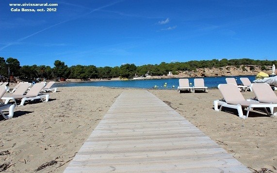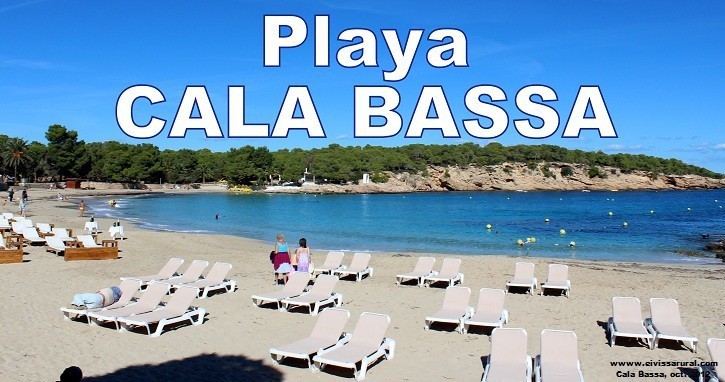Cala Bassa está a nueve kilómetros de Sant Antoni de Portmany, situada entre es Penyal, que forma parte de Àrea Natural d’Especial Interès ses Platges des Comte, y Cap de la Bassa. Esta playa paradisíaca se caracteriza por ser una ensenada con litoral irregular; por estar rodeada de acantilados bajos y pinos; por tener unas dimensiones grandes, una dorada arena fina, una orientación hacia el noroeste, el embate de un viento de intensidad floja que sopla de tierra a mar, un agua cristalina y calmada, una pendiente muy suave (a los 50 metros de la orilla se sonda un metro y medio de hondura), así como una buena oferta de servicios turísticos. Las condiciones marinas y subacuáticas son aptas para practicar buceo y para fondear embarcaciones. Existen dos zonas de calado, una al oeste, a dos hectómetros del arenal, sobre un fondo de alga, a una profundidad de 12 metros, así como otra al este, en una rada rocosa, sobre un lecho de roca y alga, a una distancia de la superficie que varía entre los ocho y los 15 metros. El acceso por carretera es sencillo siguiendo atentamente la señalización viaria y los desvíos. El vehículo particular se podrá estacionar de manera gratuita por los alrededores. También se puede llegar haciendo uso del transporte público, cuya parada de autobús más cercana se encuentra a 50 metros de distancia. En sus inmediaciones se halla una zona de acampada. Las características descritas anteriormente explican la afluencia masiva de bañista locales y turistas.